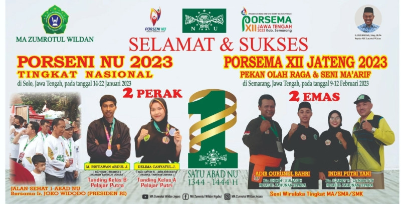 ” Ditahun 2023 ini anak didik kami meraih 2 medali perak di Porseni NU 2023 tingkat Nasional di Solo. Yang pertama M.Ristiawan Abdul J. dan Delima Cahyatul keduanya meraih medali perak Selain itu ada dualagi siswa kami meraih medali emas di PORSEMA Maarif Jateng atas nama Adib Qurunul Bahri dan Indri Putri Yani “, kata H. Nur Kholis,SAg,MPd Kepala MA Zumrotul Wildan pada kabarseputarmuria Rabu 22/2/2023.